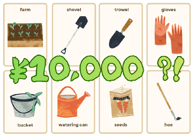 • 農具(鍬、草刈り鎌、ジョーロ)  ・・・各1000円